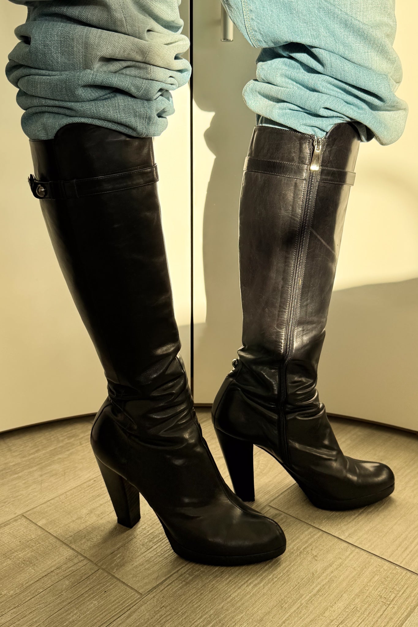 Architectural, bold, and unmistakably sophisticated — these Gianfranco Ferré knee-high boots carry the refined drama the designer was known for. Crafted in deep black leather with a sleek, sculpted silhouette, they rise just below the knee and finish with a high, elongated heel that adds height without losing elegance.